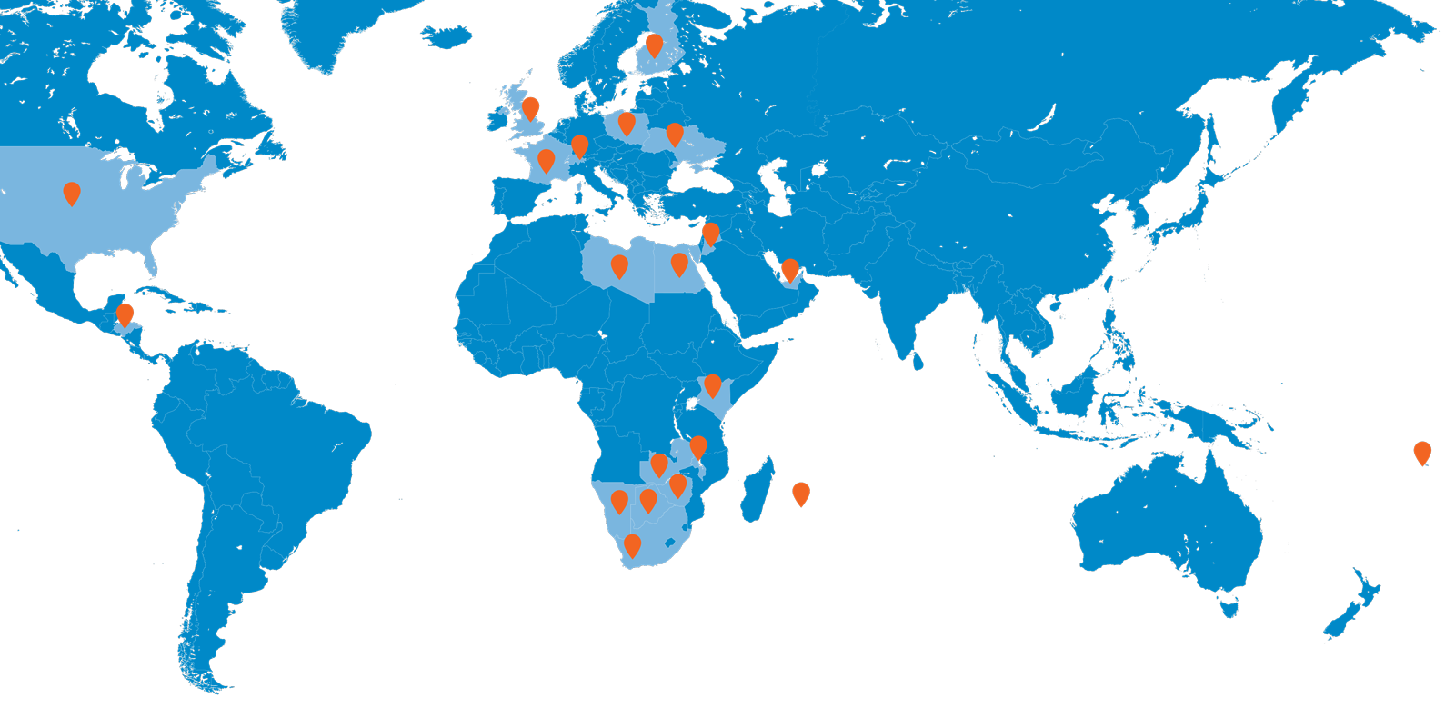 SA, Namibia, Botswana, Zimbabwe, Zambia, Malawi, Mauritius, Kenya, Egypt, Libya, Jordan, UAE, Ukraine, Poland, Switzerland, Finland, France, UK, USA, Honduras and Samoa.